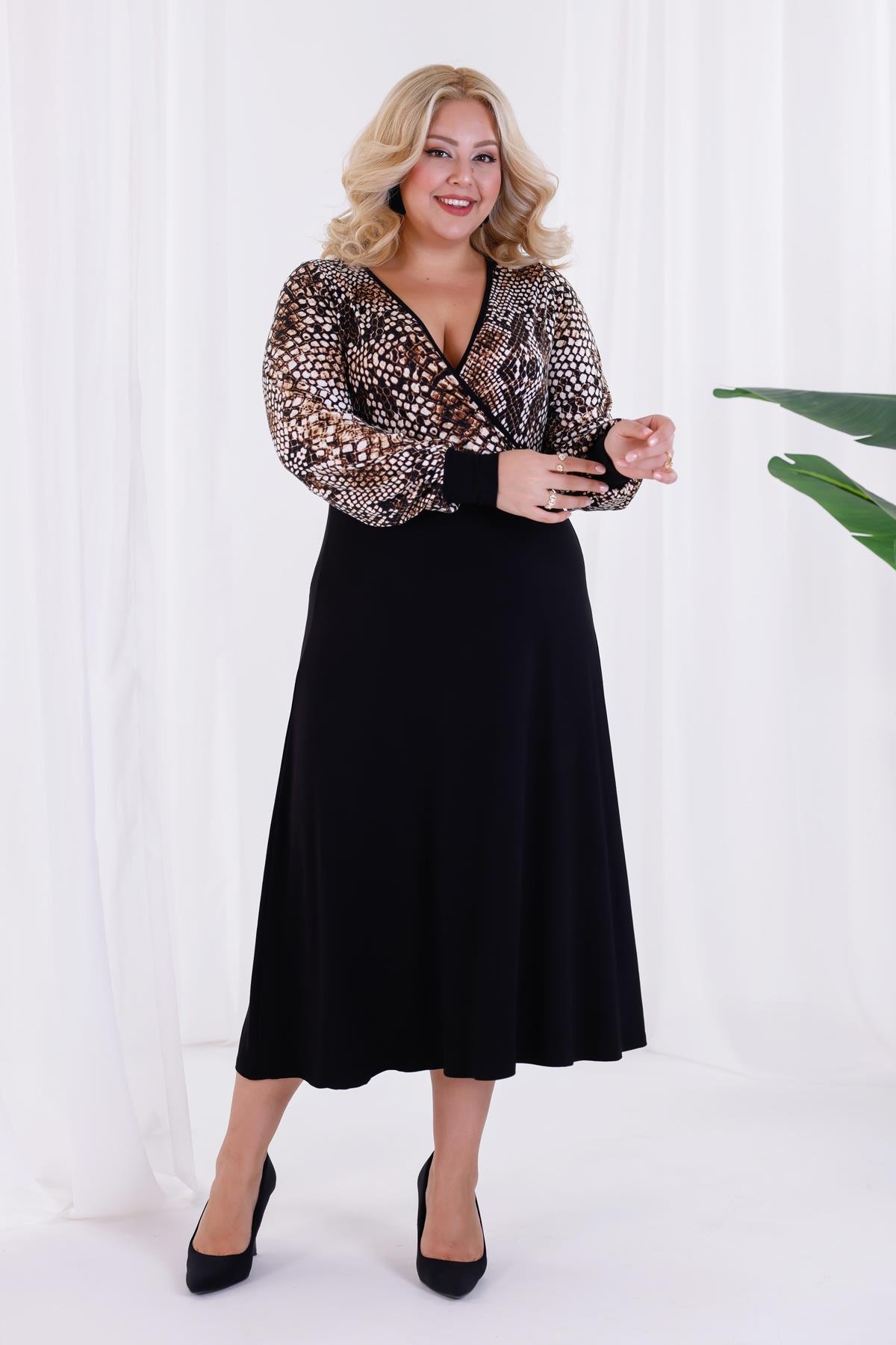 Kadın Kahve Siyah Yılan Desen Bloklu Kruvaze Yaka Balon Kol Büyük Beden Esnek Maxi Elbise (MW2602104N1X)