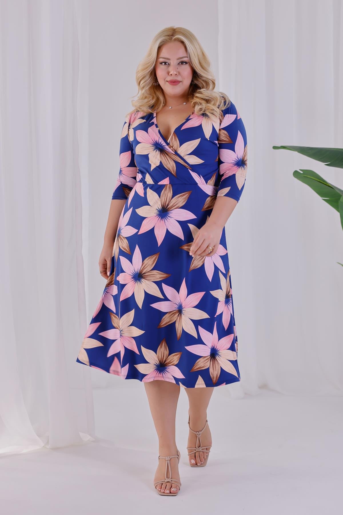 Kadın Lacivert Lotus Desen Kruvaze Yaka Beli Lastikli Büyük Beden Elbise (MW2603104N1X)