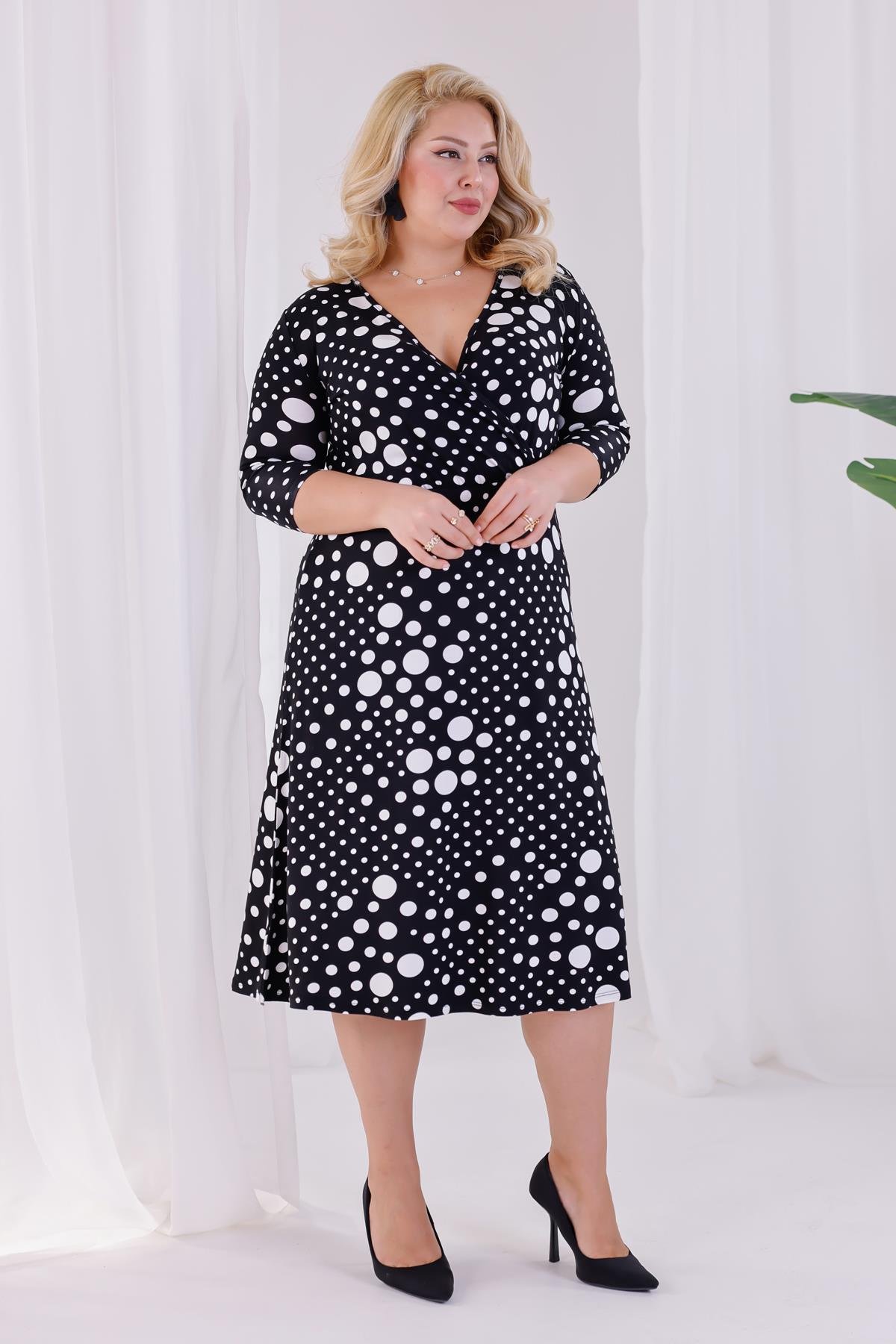 Kadın Siyah Asimetrik Puantiye Desen Kruvaze Yaka Beli Lastikli Büyük Beden Elbise